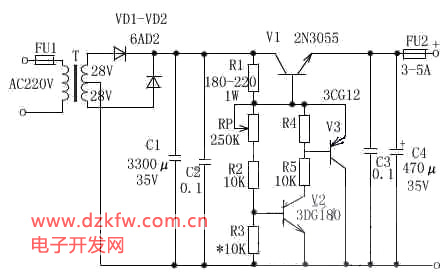 如图3所示,220v电压经变压器B降压、D1-D4整流、C1滤波。此外D5、D6、C2、C3组成倍压电路(使得Vdc=60V),Rw、R3组成分压电路,T1431、R1组成取样放大电路,9013、R2组成限流保护电路,场效应管K790作调整管(可直接并联使用)以及C5是输出滤波器电路等。稳压过程是:当输出电压降低时,f点电位降低,经T1431内部放大使e点电压增高,经K790调整后,b点电位升高;反之,当输出电压增高时,f点电位升高,e点电位降低,经K790调整后,b点电位降低。从而使输出电压稳定。当输出电流大于6A时,三极管9013处于截止,使输出电流被限制在6A以内,从而达到限流的目的。本电路除电阻R1选用2W、R2选用5W外,其它元件无特殊要求,其元件参数如图3所示。