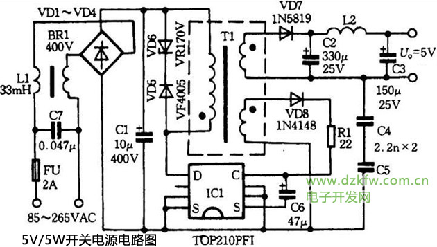 最简单的5V/5W开关电源实际如图所示。图中TOP210(IC1)为三端PWM开关。IC1中含有5V/5W开关电源的成本比常用的线性电源成本低。