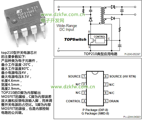 TOP210的D脚为内部输出MOSFET的漏极,C脚为内部误差放大器和反馈电流输入脚,用来调整开关电源的占空比。S脚为内部MOSFET的源极,也是内部控制电路的公共端。
