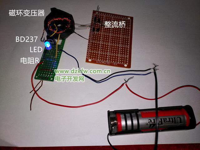 电路由两部分组成;振荡电路、升压电路、整流电路;三极管BD237、1K偏置电阻,变压器T组成了变压器反馈式振荡电路。电路直流通道形成,L1和L2同名端接法正确,电路具备振荡条件。升压变压器为自绕的磁环变压器,L\L2分别为5匝,L3为1000匝,L2为反馈线圈,L1为负载,L3为输出线圈,线径均为0.3mm;D1-D4为快恢复二极管组成了桥式整流。