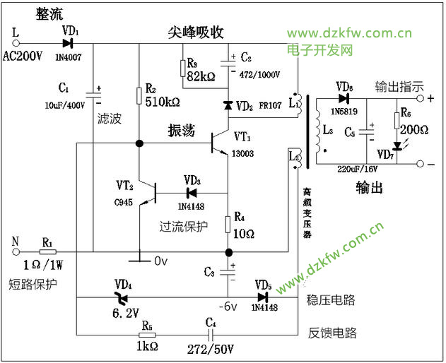 当三极管VT1截止时,会在L3两端产生上+下-的互感电动势,有电能输出,经二极管整流、滤波之后形成输出直流;VD7、R6为输出指示电路;只有截止时才会有输出,导通时没有,这就是反激式的来由。