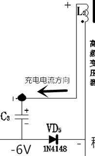 四、稳压电路:由三极管VT2、VD3、C3、VD4、VD5组成;VD5在开关三极管VT1截止时导通:L2上+,C3上+、二极管VD5形成回路;C3电压上+下-,电压6v,上端接地电位0v,则下端电位-6v,这是一个取样电压,为标准值,要使VD4导通,则在VD4左端电位0.2v即可。当电压增高时,电容C3电压增高,即下端电位低于-6v,而VD4两端电压不变,于是左端电位被拉低,低于0.2v,拉低了三极管VT1的基极电位,使其饱和时间缩短,达到了稳压目的。