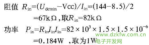 根据UC3845的参数分析可知,当启动电压低于8.5V时,UC3845的整个电路仅消耗lmA的电流,即UC3845的典型启动电压为8.5V,电流为1mA.加上外围电路损耗约0.5mA,即整个电路损耗约1.5mA.在输入直流电压为最小电压 Ddcmmn时,启动电阻Rin的计算如下: