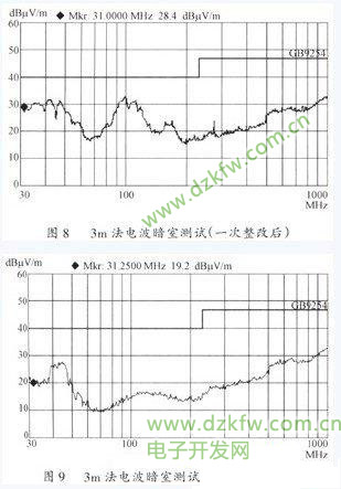 图4、图8、图9是由3m法电波暗室测得,其辐射骚扰限值为30~230MHz准峰值限值40dB,230~1000MHz准峰值限值47dB。图10是由10m法电波暗室测得,图9与图lO比较,辐射噪声波形相差不多。仅在儿个频率点的噪声电平略有增加。