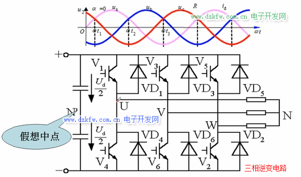 按照顺序控制开关原件就可以得到输出幅值为输入电压的一半,三相输出的波形相同,只输相位依次差120度。这样就可以得到三相的交流电源。