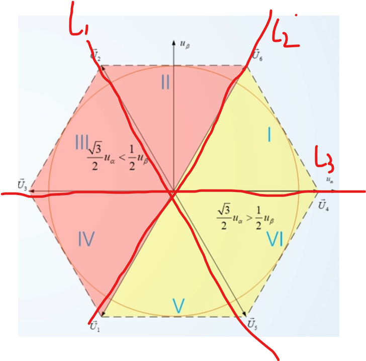 只要市网电压的线电压小于等于直流电源的电压逆变器就可以正常工作。为了能够确定任意时刻合成向量的位置,我们需要将向量空间进行划分为6个区域,在每个区域内由区域的边界向量作为基向量进行合成。为了确定合成向量的区域,我们采用三条经过原点的直线来判断合成向量的位置。如下图所示: