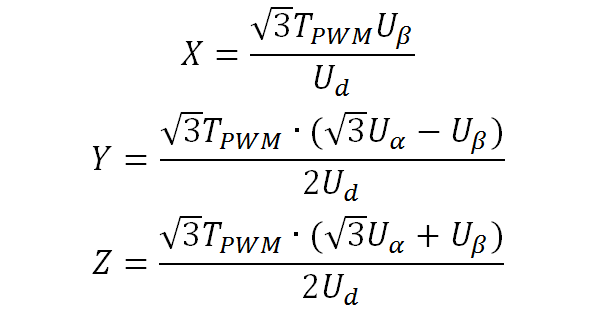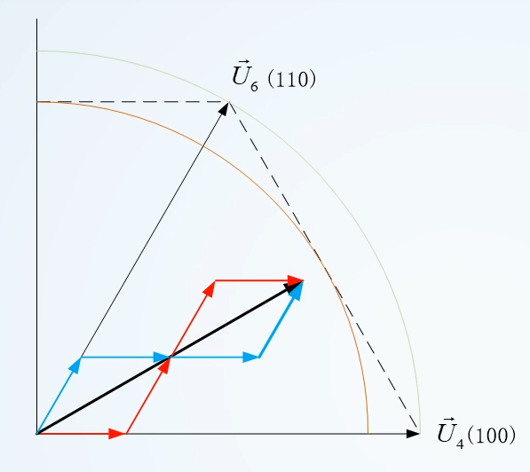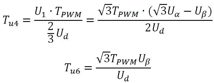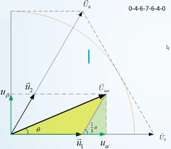 目前我们已经解决了向量的表示问题以及开关管的导通顺序,我们现在只需要通过计算每个管子的导通时间来产生想要的向量幅值及角度即可。我们仍然以区间I为例,计算当向量处于该区间时的开关管导通时间的计算。