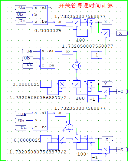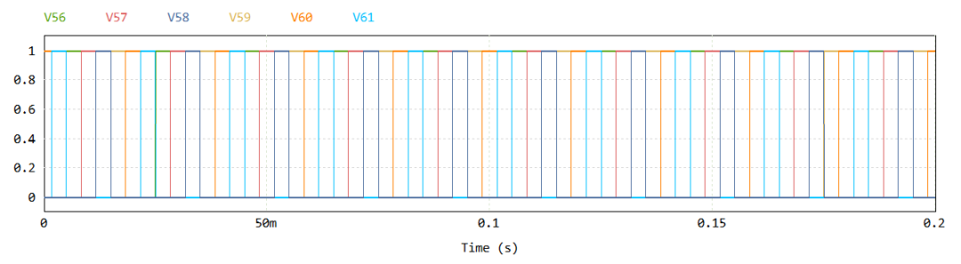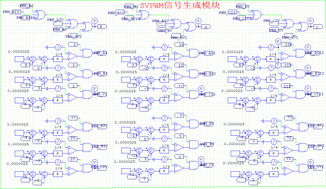 V53,V54,V55分别表示X,Y,Z的结果。由于合成向量在坐标系中做圆周运动,因此在坐标轴中的投影是一个正弦信号,所以每个开关状态的导通时间也是一个随时间变化的正弦信号。