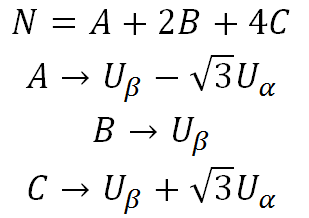 我们分别用字母A,B,C来代表该三组开关管。假设0表示上开关管闭合,下开关管断开;1表示下开关管闭合,上开关管断开。