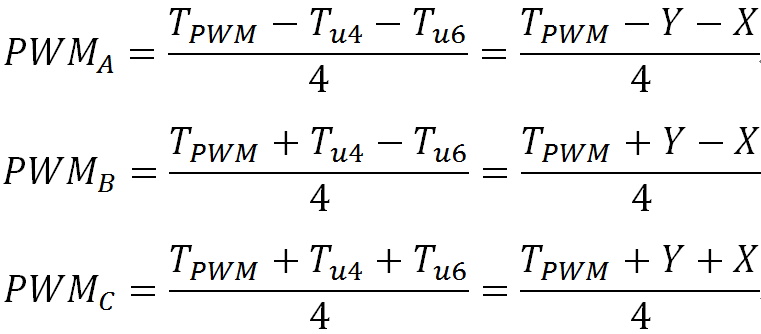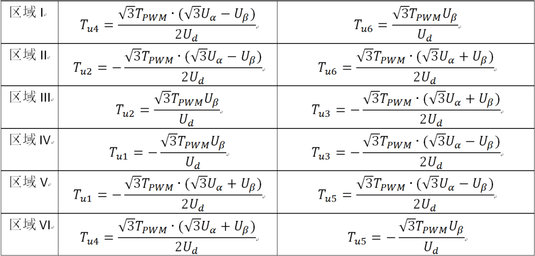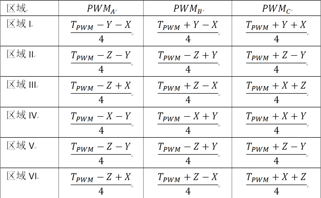 仍然以扇区I为例,我们可以根据上述得出开关管的导通时间。因此,在每个状态的结束就是下个状态的切换时间,假设A组管在扇区I的导通时间为PWMa,B组管在扇区I的导通时间为PWMb,C组管在扇区I的导通时间为PWMc,其余扇区以此类推。故: