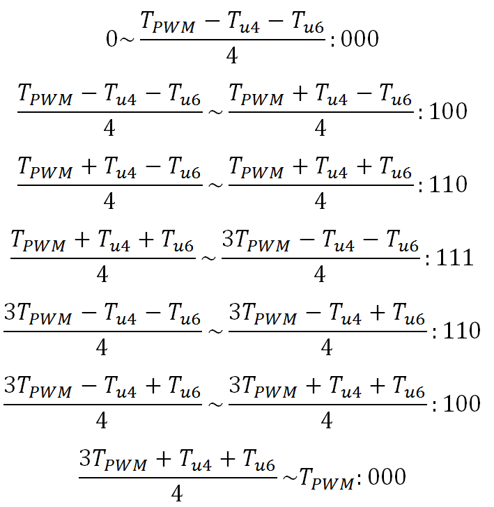 根据上面我们的开关管导通顺序可知在I区域导通顺序为000,100,110,111,110,100,000。为了尽可能使每个开关动作时间均匀分布,我们采用以下开关导通时间分布: