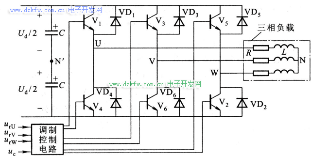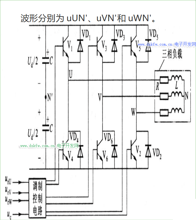 三相调制信号urU、urV和urW为相位依次相差120°的正弦波,而三相载波信号是公用一个正负方向变化的三角形波uc,如图6-23所示。U、V和W相自关断开关器件的控制方法相同,现以U相为例:在urU>uc的各区间,给上桥臂电力晶体管V1以导通驱动信号,而给下桥臂V4以关断信号,于是U相输出电压相对直流电源Ud中性点N’为uUN’ =Ud/2。在urU<uc的各区间,给V1以关断信号,V4为导通信号,输出电压uUN’ =-Ud/2。电路中VD1~VD6二极管是为电感性负载换流过程提供续流回路,其它两相的控制原理与U相相同。三相桥式PWM变频电路的三相输出的PWM波形分别为uUN’、uVN’和uWN’。