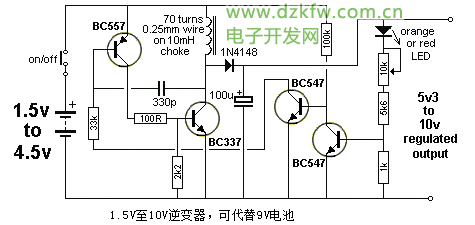 这是个非常巧妙的电路,能将1.5V电压转换至10V,以取代那些昂贵的9V电池,并还为微控制器项目提供了一个5V电源。