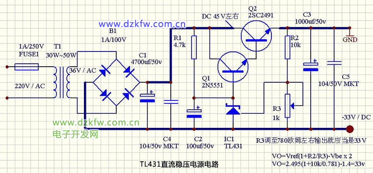 电源电路我推荐一个给你吧,这是我刚画好的。类似的我做过,效果比317 IC要好,特别是速度,你可以试做一个。输出电压你调整R3的阻值就可以,因为431的VREF会有些差异,导致计算值会有些偏差。而且把可调电阻R3放在下臂,即便它损坏开路了,也只是导致输出电压严重下降,不会烧坏放大器。