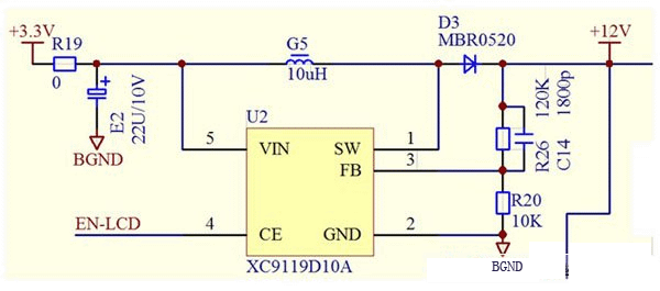 这个芯片把三极管集成到芯片内部,因此应用比较简单。因为它能提供的电流很小,是给lcd供电的。+12V后面还有一个10uF/25V的电容。