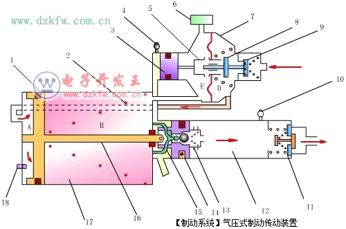 气压式制动传动装置是利用压缩空气作动力源的动力制动装置。制动时,驾驶员通过控制制动踏板的行程,便可控制制动气压的大小,得到不同的制动强度。其特点是:制动操纵省力、制动强度大、踏板行程小,但需要消耗发动机的动力;制动粗暴而且结构比较复杂。因此.一般在重型和部分中型车上采用。