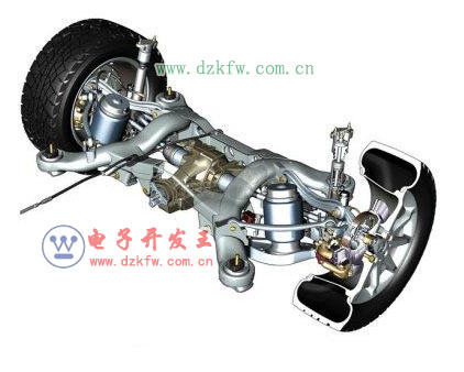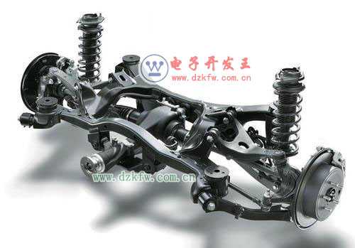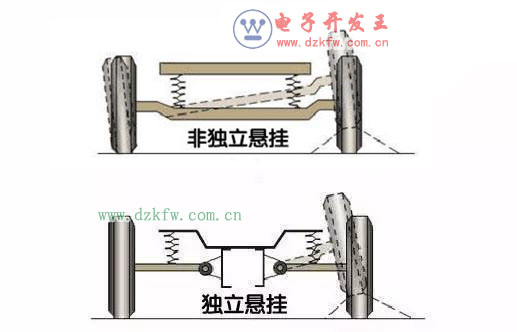 非独立悬挂是将左右两边的轮子装在同一根刚性车轴上,即两个车轮“并肩前进",就像跷跷板一样,当一侧车轮跳动时,另一侧车轮也会跟着跳动。一般载货车的前后轴及轿车的后轴常用非独立悬挂。这类悬挂结构简单、成本低、维修方便、可靠性高、轮胎磨损小。但是由于两个车轮连在一个刚性车轴上,一个轮子受到路面冲击时,必然会波及另一侧车轮,因此舒适性较差。