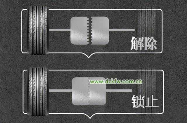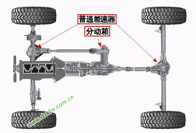 不论前桥、后桥、分动箱,想要实现正常的转弯就都得有开放式差速器(或分动箱限滑差速器),其功能是根据两车车轮的滚动阻力,智能的往两车车轮分配不同标准的动力以实现转弯时车轮的差速。