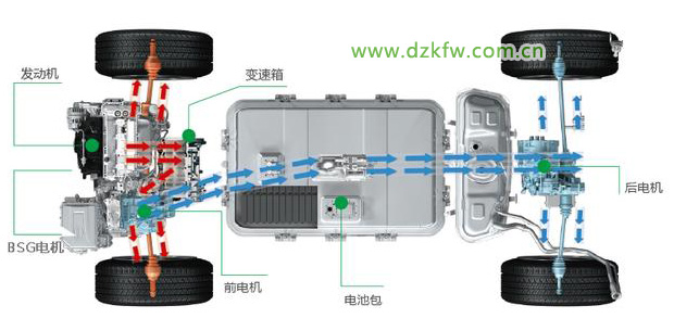 这张图片说明了电四驱的优势,那就是不需要分动箱、差速器、差速锁、传动轴去实现将动力“一分为二”各自驱动前后桥,由两台多多台发动机同时四驱。这就无需担心分动系统高强度使用会损坏的问题了,压根没有但能够实现相同的效果是不是更理想呢?