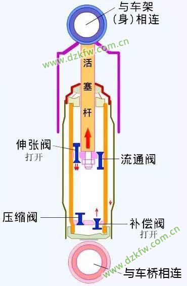 减震器被伸长时,活塞上行,上腔容积减小而下腔容积增大,伸张阀打开,上腔的油液通过伸张阀进入下腔;同时一部分油液打开补偿,由储油缸进入下腔。这两个阀对油液的节流作用使减震器产生伸张运动时的阻尼作用。