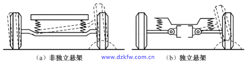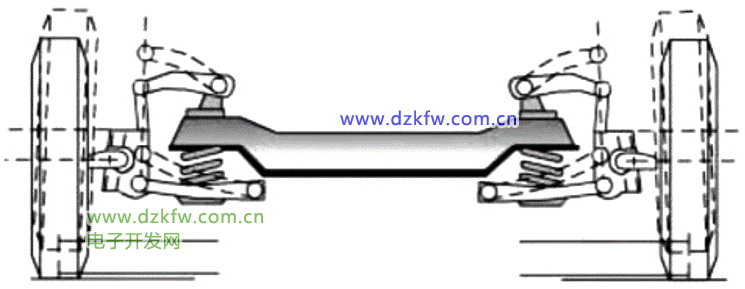 独立悬架与断开式车桥(注:断开式车桥指的是一根整体车轴中部是由活动关节的结构所组成,并不相连,从而两端车轮车轮不相连。)配用,两侧车轮各自独立地通过弹性元件悬挂在车架或车身下面。当一侧车轮相对于车架或车身发生位置变化时,对另一侧车轮几乎不受影响。