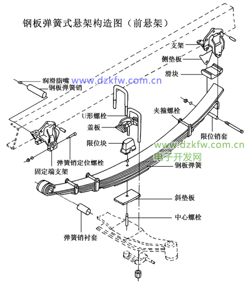 钢板弹簧式非独立悬架是指采用钢板弹簧作为弹性元件且与汽车纵向轴线平行地布置在汽车上的一种悬架。钢板弹簧中部用两个U形螺栓固定在车桥上。