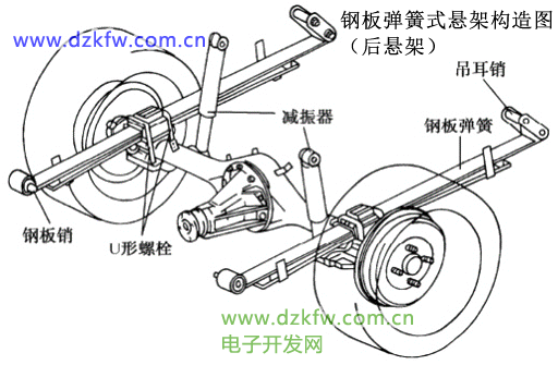 后悬架为钢板弹簧的前端卷耳用钢板销与前支架相连,是固定铰接支点,起传力和导向作用。后端卷耳通过可在车架上摆动的吊耳后支架相连,是摆动铰接支点。当钢板弹簧变形时,两端卷耳中心距离相应地改变。两端卷耳内有衬套与钢板销配合,销上有径向和轴向油道,从油嘴将润滑脂注入衬套润滑。减震器的两个吊耳内也有橡胶衬套,通过销分别与车架、车桥的支架连接。