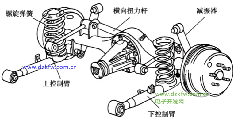 螺旋弹簧式非独立悬挂主要由螺旋弹簧、减震器、下控制臂、横向扭力杆等几部分组成。