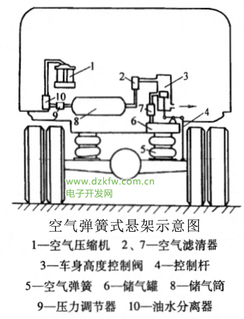 空气弹簧式非独立悬架指的是非独立悬架中的弹性元件采用空气弹簧时的悬架。由压气机、储气筒、高度控制阀、空气弹簧、控制杆、减震器、导向臂、横向稳定杆等组成。当然,一般来说是由油气弹簧、横向推力杆、缓冲块、纵向推力杆等部件组成。油气弹簧上端固定在车架上,下端固定在前轴上。左右两侧各用一根下纵向推力杆装在前轴和纵梁之间。一根上纵向推力杆安装在前轴和纵梁的内侧支架上。上下纵向推力杆构成平行四边形,用来保证车轮上下跳动时,主销后倾角不变。横向推力杆安装在左侧纵梁与前轴右侧的支架上,于两纵梁下方装有缓冲块。
