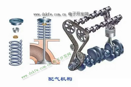 配气机构的功用是根据发动机的工作顺序和工作过程,定时开启和关闭进气门和排气门,使可燃混合气或空气进入气缸,并使废气从气缸内排出,实现换气过程。配气机构大多采用顶置气门式配气机构,一般由气门组、气门传动组和气门驱动组组成。