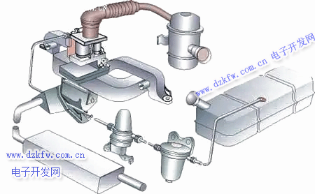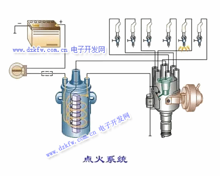 在汽油机中,气缸内的可燃混合气是靠电火花点燃的,为此在汽油机的气缸盖上装有火花塞,火花塞头部伸入燃烧室内。能够按时在火花塞电极间产生电火花的全部设备称为点火系,点火系通常由蓄电池、发电机、分电器、点火线圈和火花塞等组成。