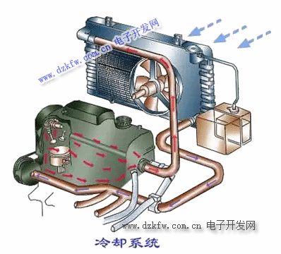 冷却系的功用是将受热零件吸收的部分热量及时散发出去,保证发动机在最适宜的温度状态下工作。水冷发动机的冷却系通常由冷却水套、水泵、风扇、水箱、节温器等组成。