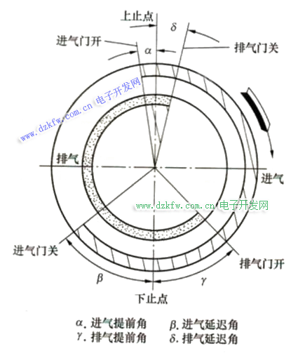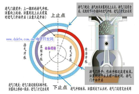 实际上发动机转速很高,活塞从上到下的时间很短,为了使发动机进气更多,排气更彻底。发动机在设计时,都采用了延长进、排气门开启时间的方法。即气门的开启和关闭并不正好处在活塞的上、下止点,而分别提早和延迟一定的曲轴转角,俗称气门的早开晚关。