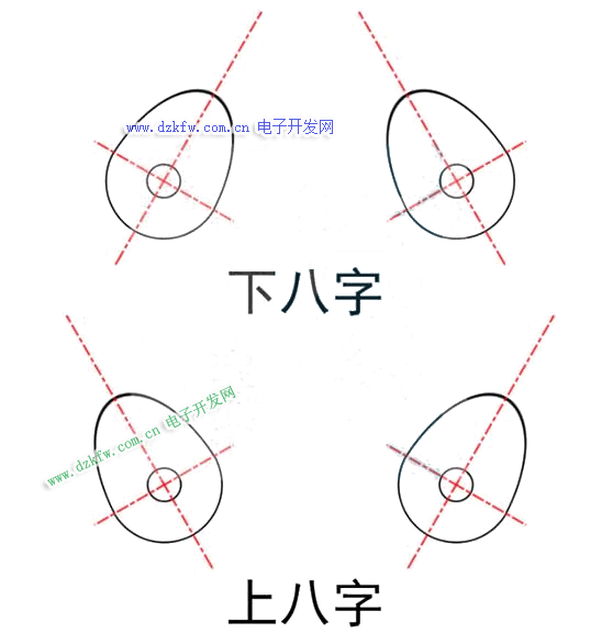 上八字与下八字指的是顶置双凸轮轴发动机位于一缸上止点时,一缸凸轮轴凸缘处位置形状的一种形象描述,如下图