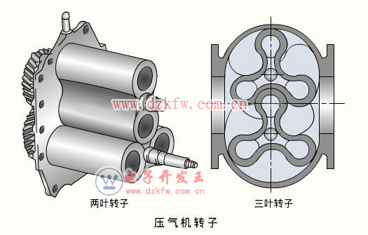 罗茨式压气机的转子有两叶的,也有三叶的。通常两叶转子为直线型,而三叶转子为螺旋型。三叶螺旋型转子有较低的工作噪声和较好的增压器特性。在相互啮合的转子之间以及转子与壳体之间都有很小的间隙,并在转子表面涂敷树脂,以保持转子之间以及转子与壳体间较好的气密性。转子用铝合金制造。