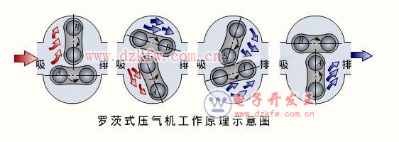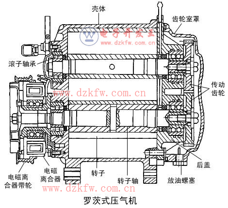 当转子旋转时,空气从压气机入口吸入,在转子叶片的推动下空气被加速,然后从压气机出口压出。出口与进口的压力比可达1.8。罗茨式压气机结构简单、工作可靠、寿命长,供气量与转速成正比。
