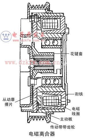 电磁离合器安装在传动带轮中。电控单元根据发动机 工况的需要,发出接通或切断电磁离合器电源的指令,以控制增压器的工作。当接通电源时,电磁线圈通电,主动板吸引从动摩擦片,使离合器处于接合状态,增压器工作。当切断电源时,电磁线圈断电,主动板与从动摩擦片分开,增压器停止转动。