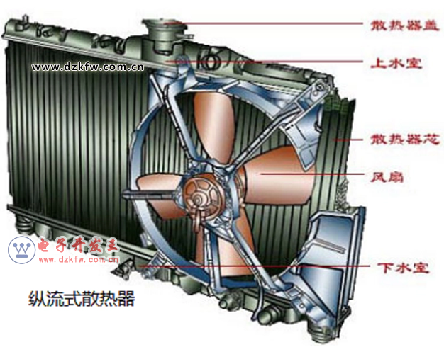 来自发动机水套的热水,自上而下或横向的被分成许多小股并将其热量散给周围的空气。增大散热面积,加速水的冷却。冷却水经过散热器后,其温度可降低10~15℃,为了将散热器传出的热量尽快带走,在散热器后面装有风扇与散热器配合工作。