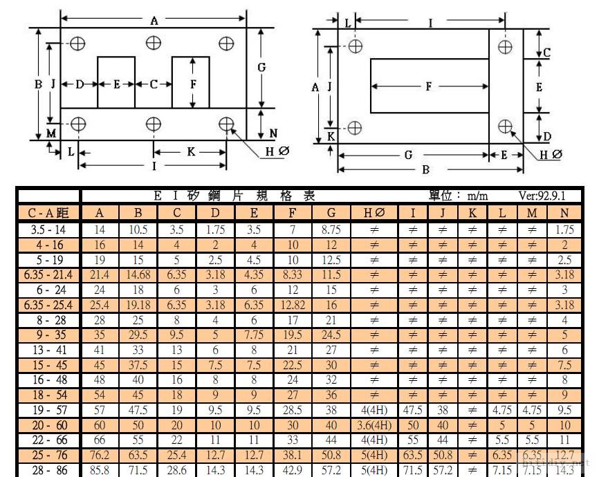 | 适用三个系列: 1.常用系列:EI28/35/41/48/57/66/76(76.2)/86(85.8)/96/105/114/133(133.2) 2.国标系列:EI30/38/42/48/54/60/66/75/84/96/108/120/150 3.老部标系列:GE10/12/14/16/GEB19/22/26/30/35/40 说明: 所列铁心片规格中,序列1为国外常用规格,序列2为国标规格,序列3为部标规格(已淘汰,只供维修时选用)。 铁心片详细尺寸见下面各表 常用系列EI铁心尺寸数据 下载 (20.55 KB) 2009-6-17 08:07 | ||||||||||||||||||||||||||||||||||||||||||||||||||||||||||||||||||||||||||||||||||||||||||||||||||