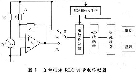 基于数字鉴相的自由轴法RLC测量系统构成如图1所示,主要由正弦信号源U0、前端测量电路、相敏检波器、A/D转换器、微处理器、基准相位发生器以及键盘、显示电路等组成。
