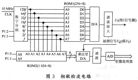 本电路所采用的数字相敏检波器比传统的模拟相敏检波器具有无法比拟的优点。通过乘法型D/A转换器进行数字鉴相,减少了传统模拟鉴相器开关动作过程中出现的尖脉冲,提高了测量精度;两个相互垂直的相位参考基准信号通过ROM2准确获得,相位参考基准信号电路比模拟相敏检波器大大简化;此外鉴相器使用D/A转换器后电路的温度系数进一步减小。