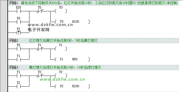 我们将编写一个交通灯时间控制程序,其中红、黄、绿三种颜色的灯分别由元件Y0、Y1、Y2表示 其控制逻辑如下:
