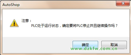 5、如果当前PLC处于停止状态则直接进入下一步;如果当前PLC处于运行状态,则弹出窗口询问是否停机,单击“确定”继续,如下图所示: