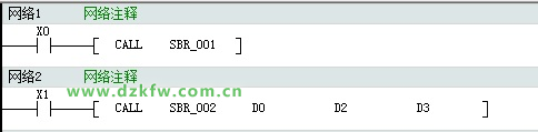 由上面的示例程序可知,若X0为ON,则执行CALL跳转指令,将会到子程序SBR_01中去执行,执行完子程序SBR_01后,继续回到主程序中执行下个语句;同样,若果X1为ON,则会跳转到子程序SBR_02中去执行直到程序执行完毕。