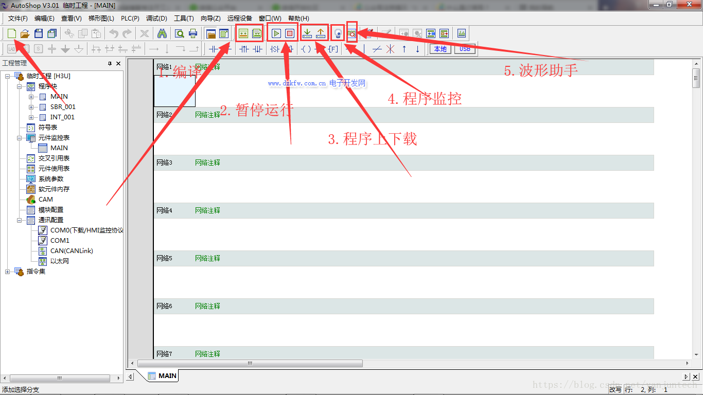图上把常用的菜单功能键基本标出来了,自己新建一个文件夹。可以把鼠标放在在工程名字上,右键选择属性,更改项目PLC的类型。写完程序,先编译后下载,然后进行在线监控查bug。汇川软件还有一个在线监控修改程序的功能,可以在设备不停机的情况下修改PLC的程序。示波器旁边的就是在线监控修改程序功能,也挺好用的。