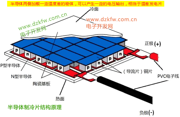 用半导体制成的温差电池赛贝克效应较强,热能转化为电能的效率也较高,因此,可将多个这样的电池组成温差电堆,作为小功率电源。它的工作原理是,将两种不同类型的热电转换材料N型和P型半导体的一端结合并将其置于高温状态,另一端开路并给以低温时,由于高温端的热激发作用较强,空穴和电子浓度也比低温端高,在这种载流子浓度梯度的驱动下,空穴和电子向低温端扩散,从而在低温开路端形成电势差;如果将许多对P型和N型热电转换材料连接起来组成模块,就可得到足够高的电压,形成一个温差发电机。