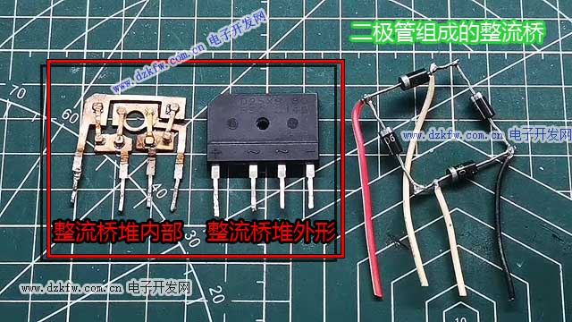 从图中可以很清楚的看出中间两只脚上标注的是“~”,这表示这两只脚接输入交流电,两边一正一负表示输出的直流正负极。其内部就是四只二极管组成的桥式整流电路,如上图,只不过是将它们封装在一起了。