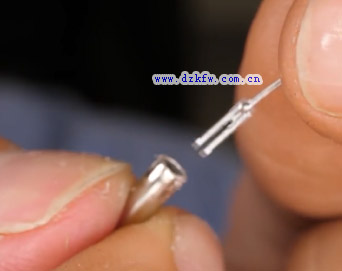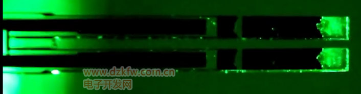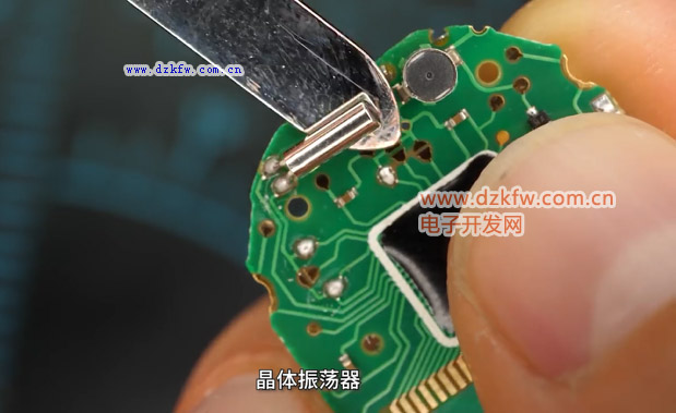晶振中的石英晶体为一薄片,薄片两端涂有导电的银层,并连出两个电极,如下图1-1所示为电子手表中所用晶振的内部晶片。