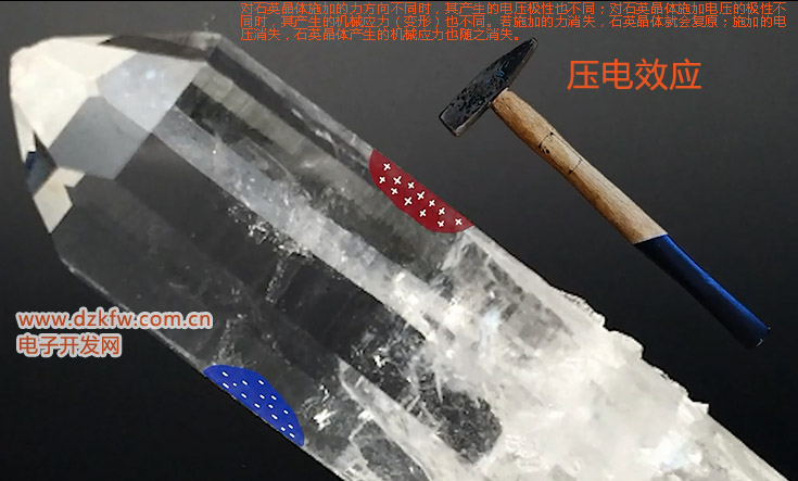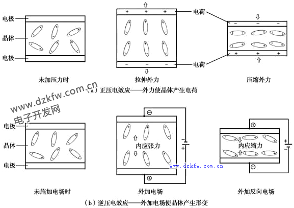 根据图1-2所示,对石英晶体施加的力方向不同时,其产生的电压极性也不同;对石英晶体施加电压的极性不同时,其产生的机械应力(变形)也不同。另外,若施加的力消失,石英晶体就会复原;施加的电压消失,石英晶体产生的机械应力也随之消失。
