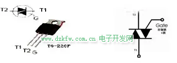 如图上所示。因为它是双向元件,所以不管T1 ,T2的电压极性如何,若G极有信号加入时,则T1 ,T2间呈导通状态;反之,加G极触发信号,则T1 ,T2间有极高的阻抗。
